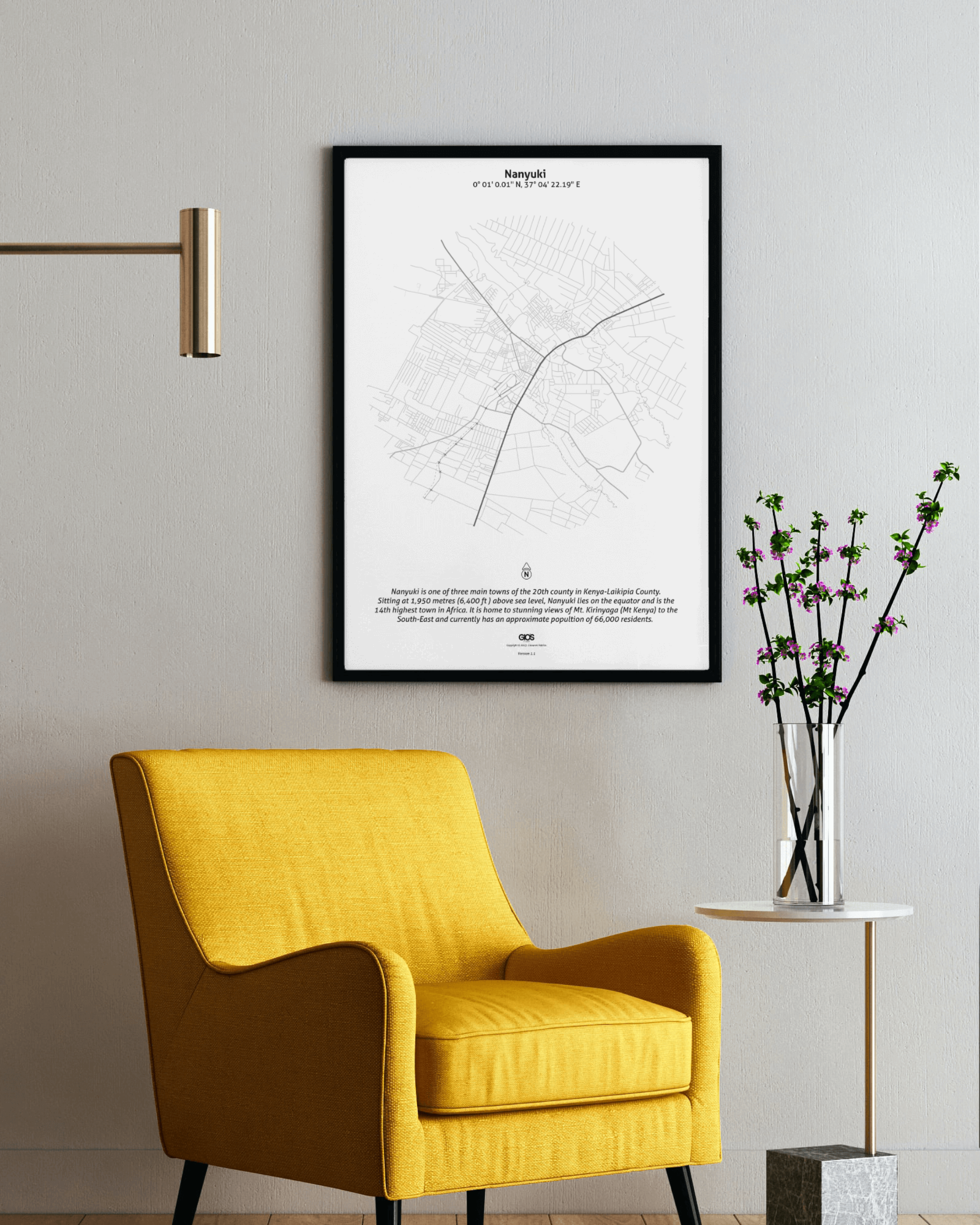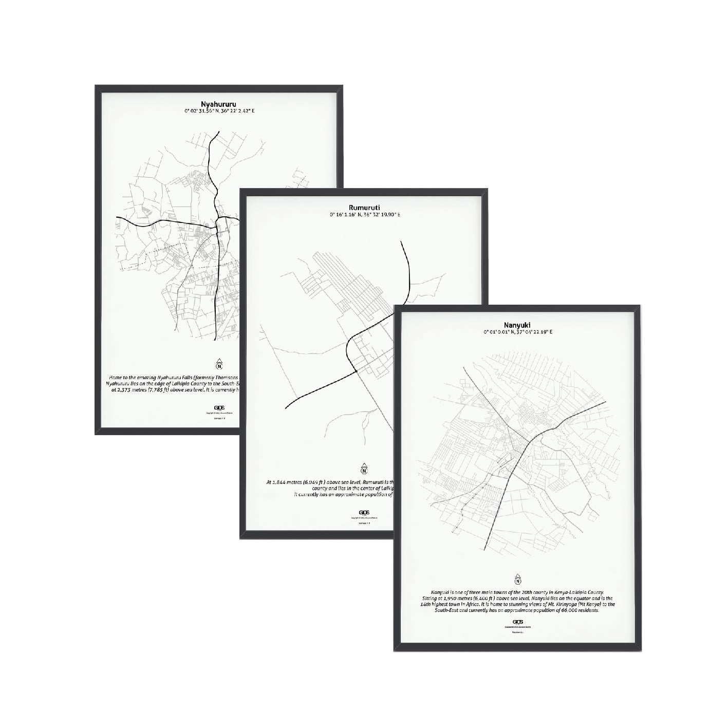 Minimal maps of the three main towns in Laikipia County, Kenya; Nanyuki,...