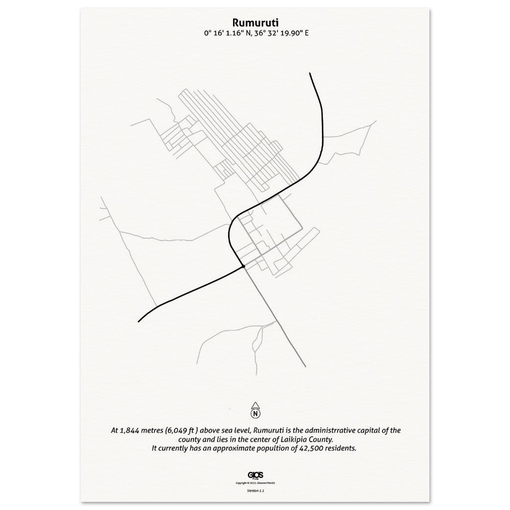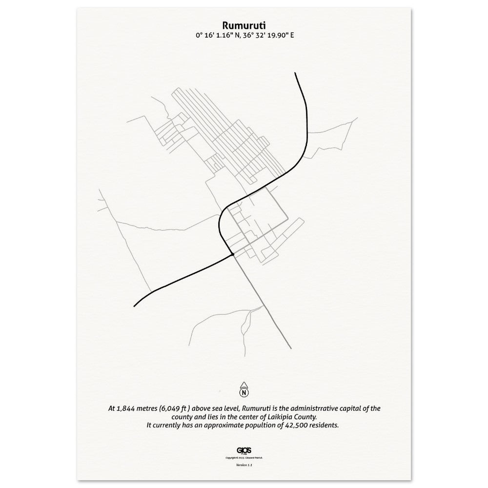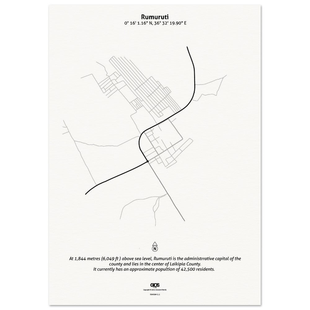 This minimalist map of Rumuruti Town, in Laikipia County, Kenya is printed on master's edition, off-white, archival museum-quality paper, it is uncoated and the superior choice for art enthusiasts who appreciate world-class quality to enjoy artworks most luxuriously.